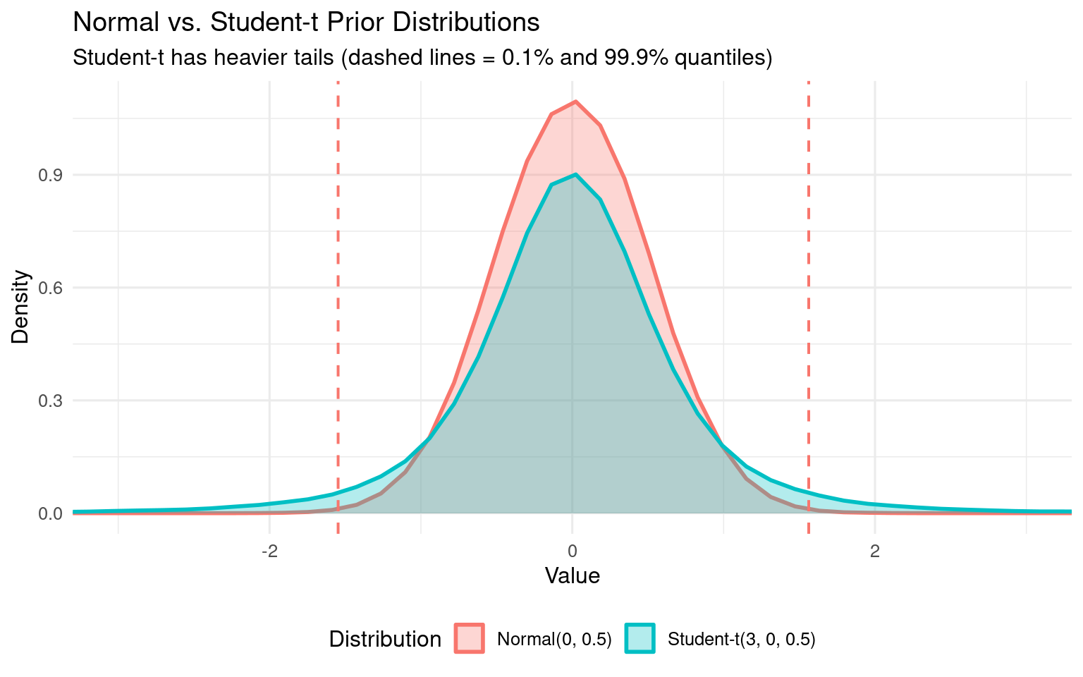 # Graphical comparisonlibrary(ggplot2)comparison_df <-data.frame(value =c(normal_samples, studentt_samples),distribution =rep(c("Normal(0, 0.5)", "Student-t(3, 0, 0.5)"), each = n_samples))ggplot(comparison_df, aes(x = value, fill = distribution, color = distribution)) +geom_density(alpha =0.3, linewidth =1) +geom_vline(xintercept = normal_99, linetype ="dashed", color ="#F8766D", linewidth =0.7) +geom_vline(xintercept = studentt_99, linetype ="dashed", color ="#00BFC4", linewidth =0.7) +coord_cartesian(xlim =c(-3, 3)) +scale_fill_manual(values =c("#F8766D", "#00BFC4")) +scale_color_manual(values =c("#F8766D", "#00BFC4")) +labs(title ="Normal vs. Student-t Prior Distributions",subtitle ="Student-t has heavier tails (dashed lines = 0.1% and 99.9% quantiles)",x ="Value",y ="Density",fill ="Distribution",color ="Distribution" ) +theme_minimal(base_size =12) +theme(legend.position ="bottom")