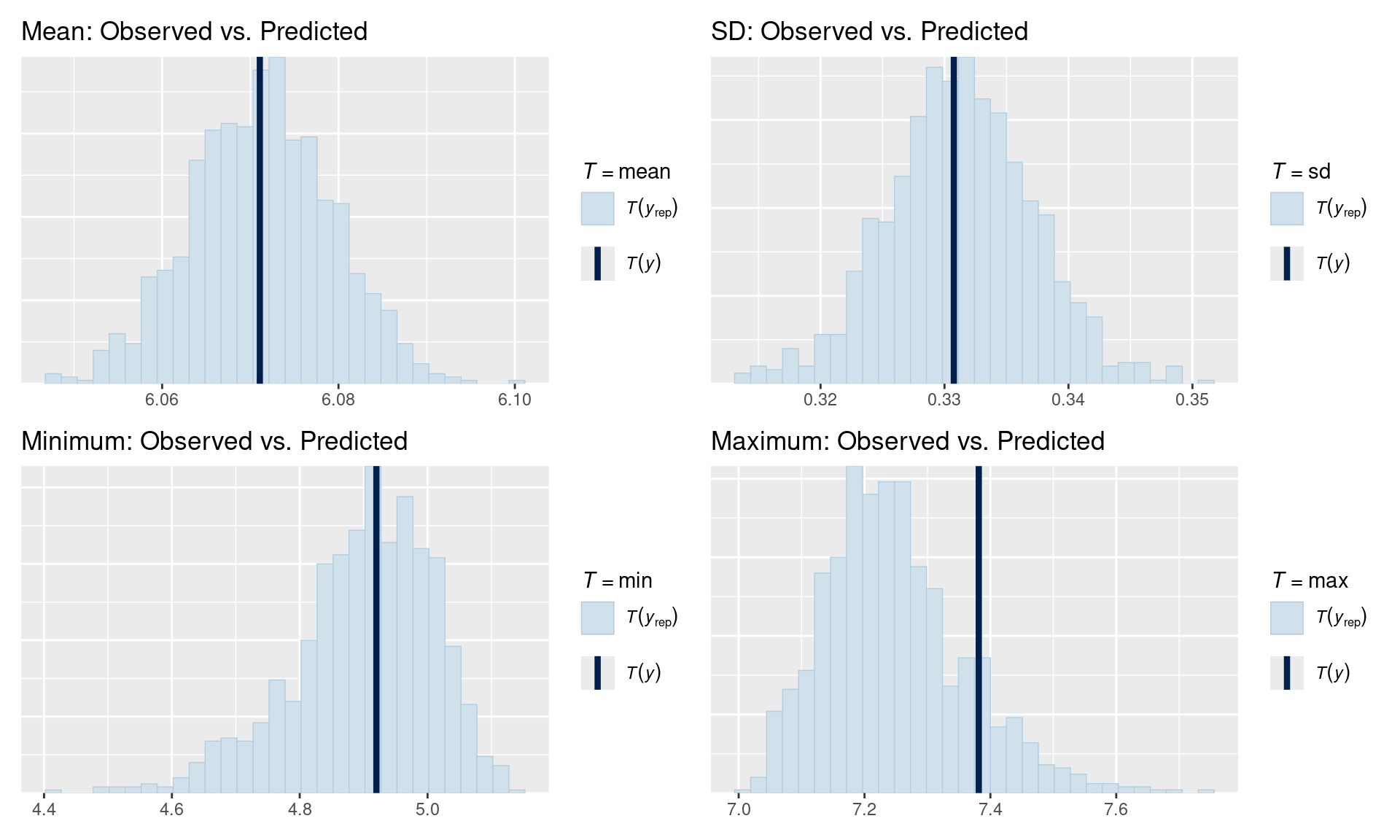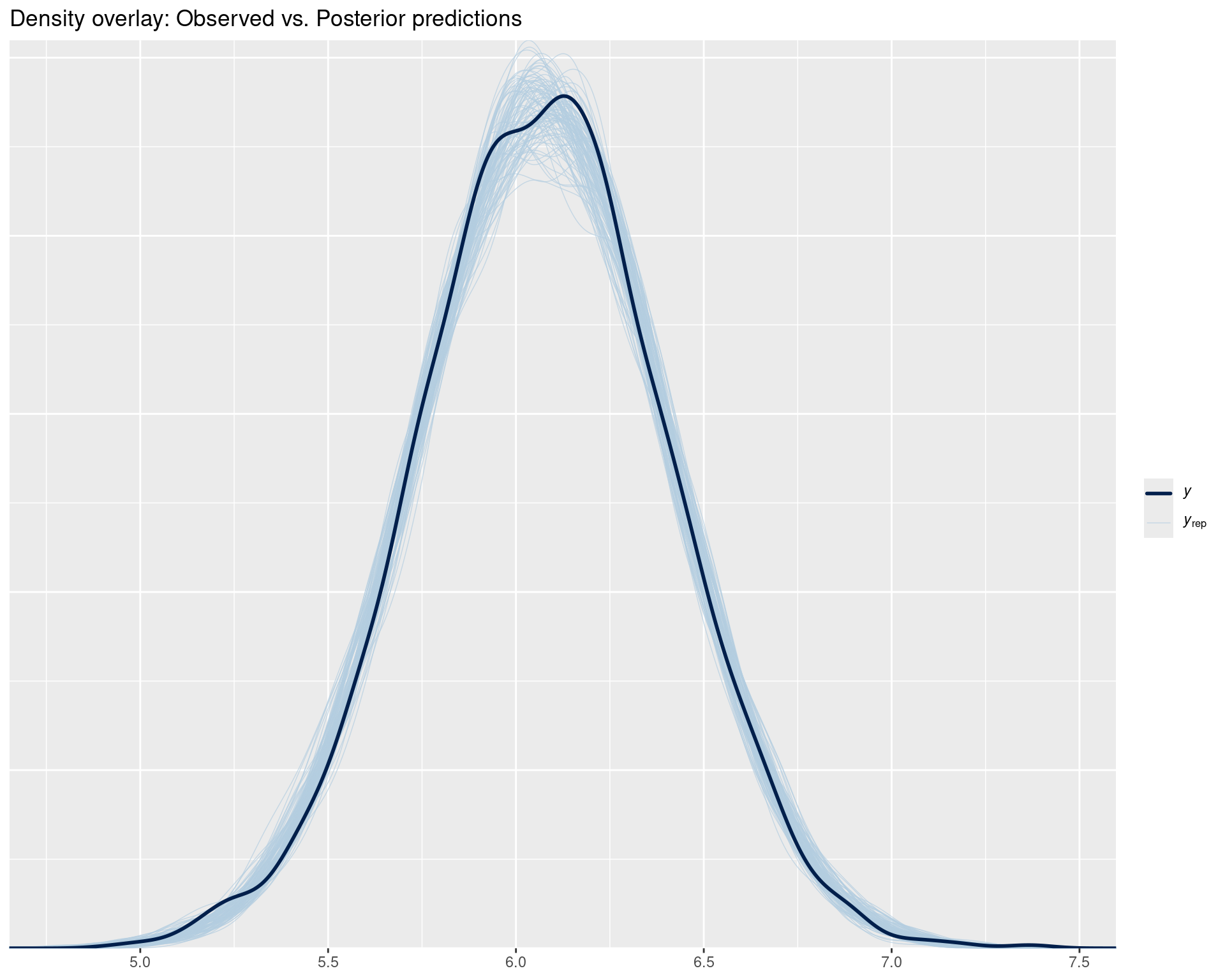 y = observed data) should be among the blue lines (yrep = posterior predictions)# Did we get the mean right?