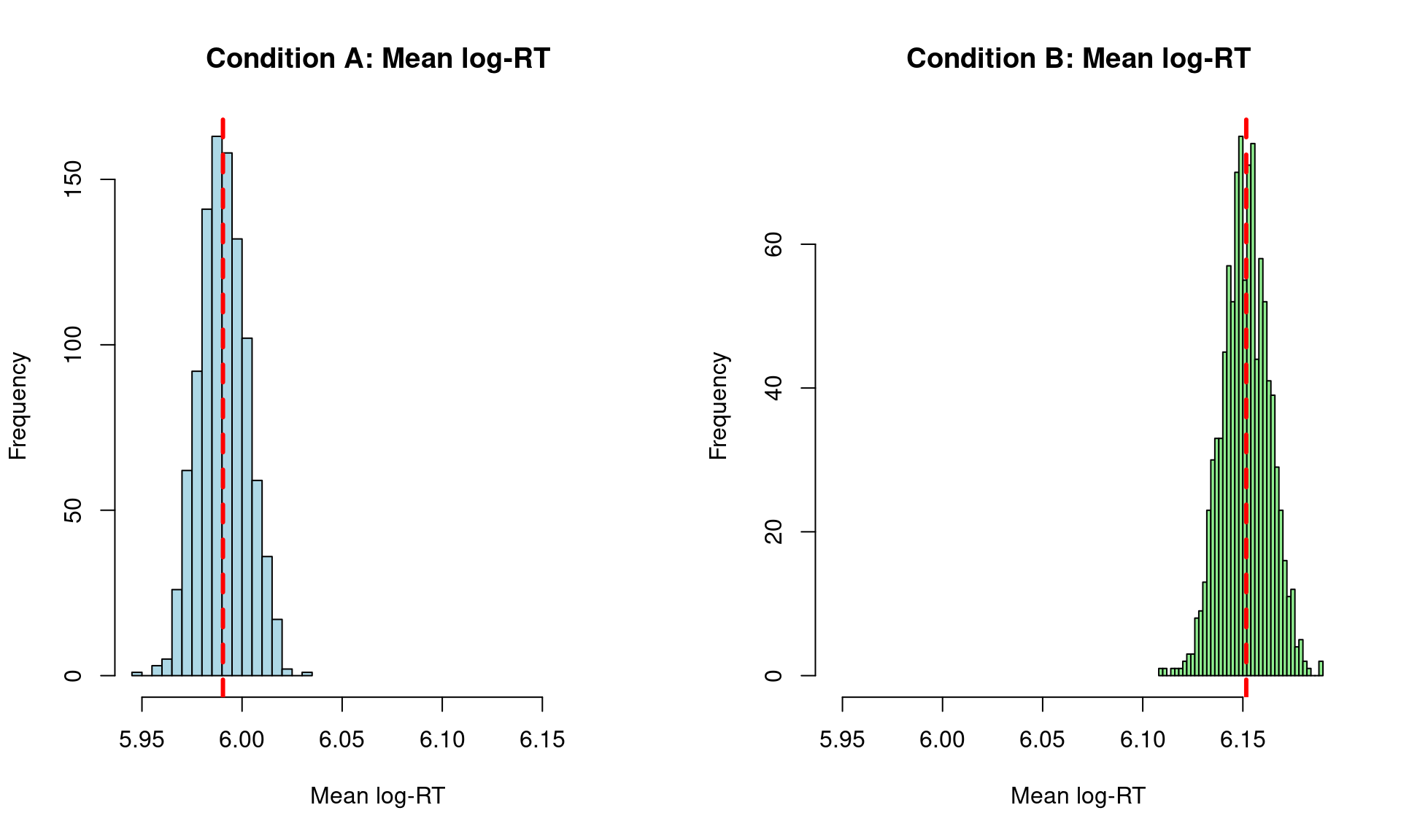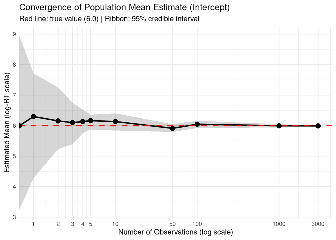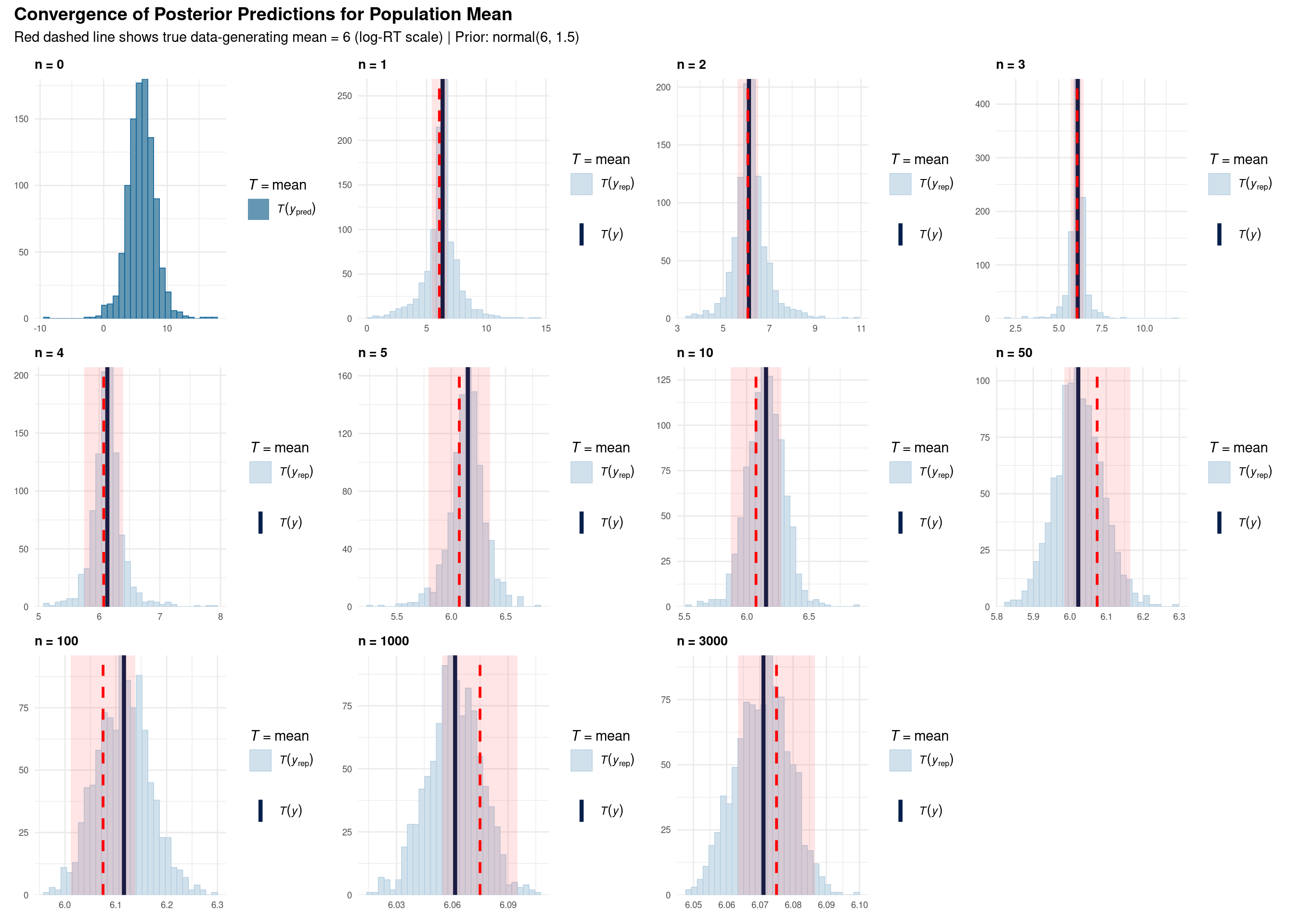 subtitle = "Red dashed line shows true data-generating mean = 6 (log-RT scale) | Prior: normal(6, 1.5)",