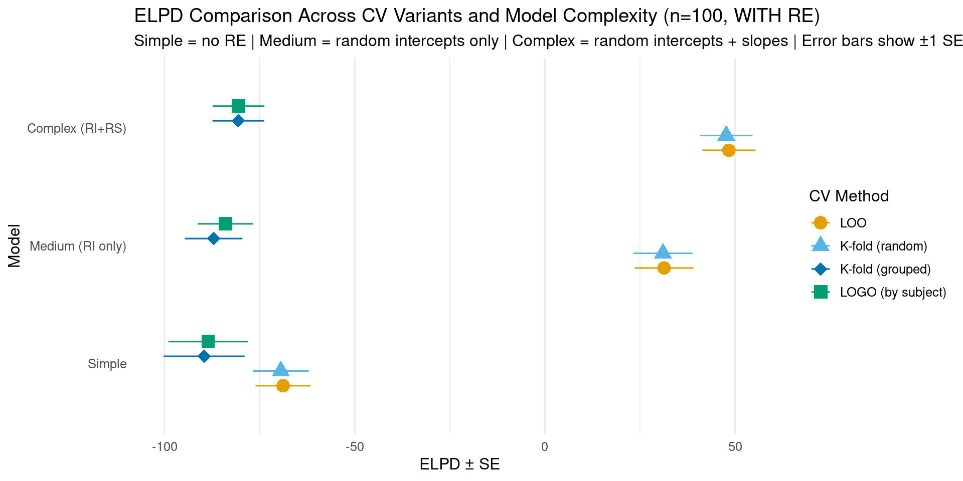 # Create comparison data frame for all four CV methods# Using custom fold assignments, all methods now work for all three models!cv_comparison <-data.frame(Method =rep(c("LOO", "K-fold (random)", "K-fold (grouped)", "LOGO (by subject)"), each =3),Model =rep(c("Simple", "Medium (RI only)", "Complex (RI+RS)"), 4),ELPD =c( loo_simple_100$estimates["elpd_loo", "Estimate"], loo_medium_100$estimates["elpd_loo", "Estimate"], loo_complex_100$estimates["elpd_loo", "Estimate"], kfold_simple_100$estimates["elpd_kfold", "Estimate"], kfold_medium_100$estimates["elpd_kfold", "Estimate"], kfold_complex_100$estimates["elpd_kfold", "Estimate"], kfold_grouped_simple_100$estimates["elpd_kfold", "Estimate"], kfold_grouped_medium_100$estimates["elpd_kfold", "Estimate"], kfold_grouped_complex_100$estimates["elpd_kfold", "Estimate"], logo_simple_100$estimates["elpd_kfold", "Estimate"], logo_medium_100$estimates["elpd_kfold", "Estimate"], logo_complex_100$estimates["elpd_kfold", "Estimate"] ),SE =c( loo_simple_100$estimates["elpd_loo", "SE"], loo_medium_100$estimates["elpd_loo", "SE"], loo_complex_100$estimates["elpd_loo", "SE"], kfold_simple_100$estimates["elpd_kfold", "SE"], kfold_medium_100$estimates["elpd_kfold", "SE"], kfold_complex_100$estimates["elpd_kfold", "SE"], kfold_grouped_simple_100$estimates["elpd_kfold", "SE"], kfold_grouped_medium_100$estimates["elpd_kfold", "SE"], kfold_grouped_complex_100$estimates["elpd_kfold", "SE"], logo_simple_100$estimates["elpd_kfold", "SE"], logo_medium_100$estimates["elpd_kfold", "SE"], logo_complex_100$estimates["elpd_kfold", "SE"] )) %>%mutate(Method =factor(Method, levels =c("LOO", "K-fold (random)", "K-fold (grouped)", "LOGO (by subject)")),Model =factor(Model, levels =c("Simple", "Medium (RI only)", "Complex (RI+RS)")) )# Determine winner for each methodcv_comparison <- cv_comparison %>%group_by(Method) %>%mutate(is_winner = ELPD ==max(ELPD)) %>%ungroup()# Create plot with method as color/shapeggplot(cv_comparison, aes(x = ELPD, y = Model, color = Method, shape = Method)) +geom_pointrange(aes(xmin = ELPD - SE, xmax = ELPD + SE),size =1,position =position_dodge(width =0.5) ) +scale_color_manual(values =c("LOO"="#E69F00", "K-fold (random)"="#56B4E9", "K-fold (grouped)"="#0072B2", "LOGO (by subject)"="#009E73"),name ="CV Method" ) +scale_shape_manual(values =c("LOO"=16, "K-fold (random)"=17, "K-fold (grouped)"=18, "LOGO (by subject)"=15),name ="CV Method" ) +labs(title ="ELPD Comparison Across CV Variants and Model Complexity (n=100, WITH RE)",subtitle ="Simple = no RE | Medium = random intercepts only | Complex = random intercepts + slopes | Error bars show ±1 SE",x ="ELPD ± SE",y ="Model" ) +theme_minimal(base_size =12) +theme(legend.position ="right",panel.grid.major.y =element_blank() )