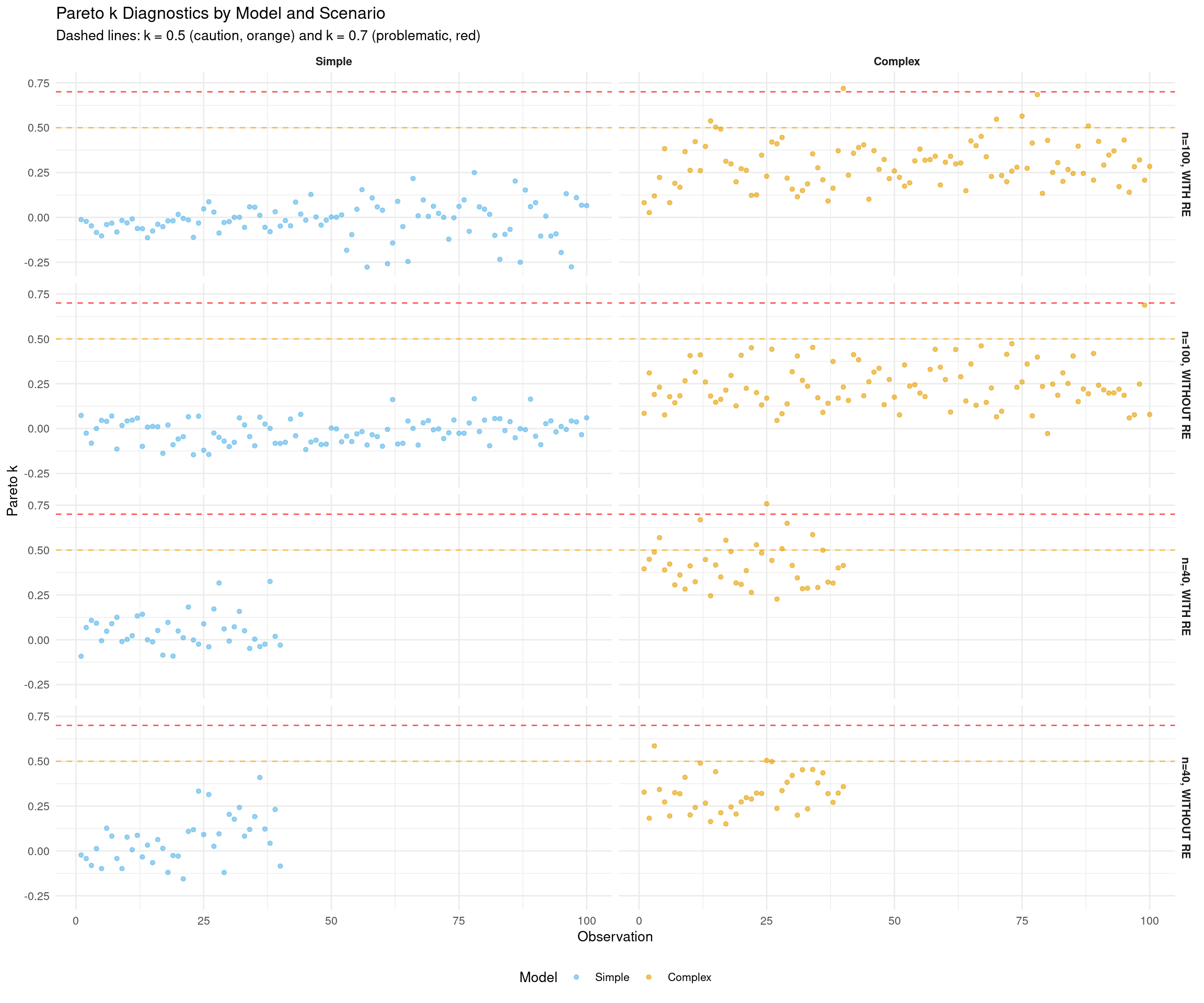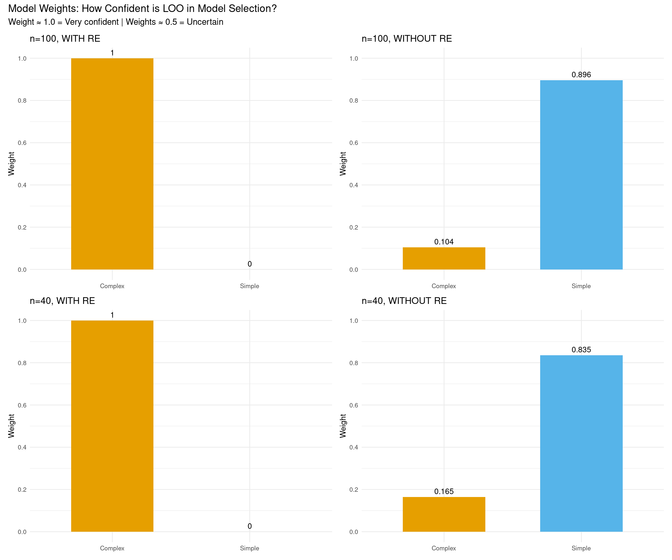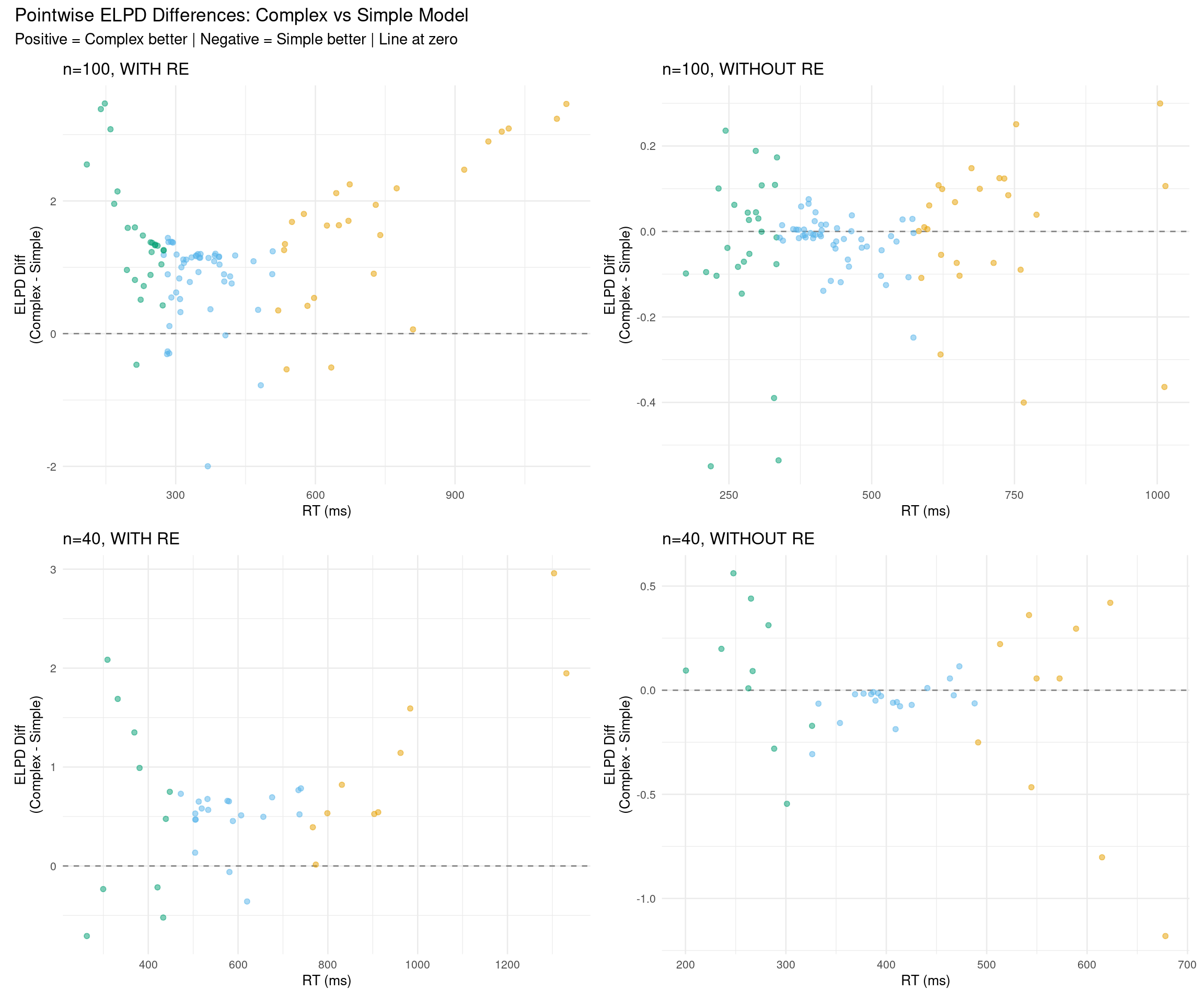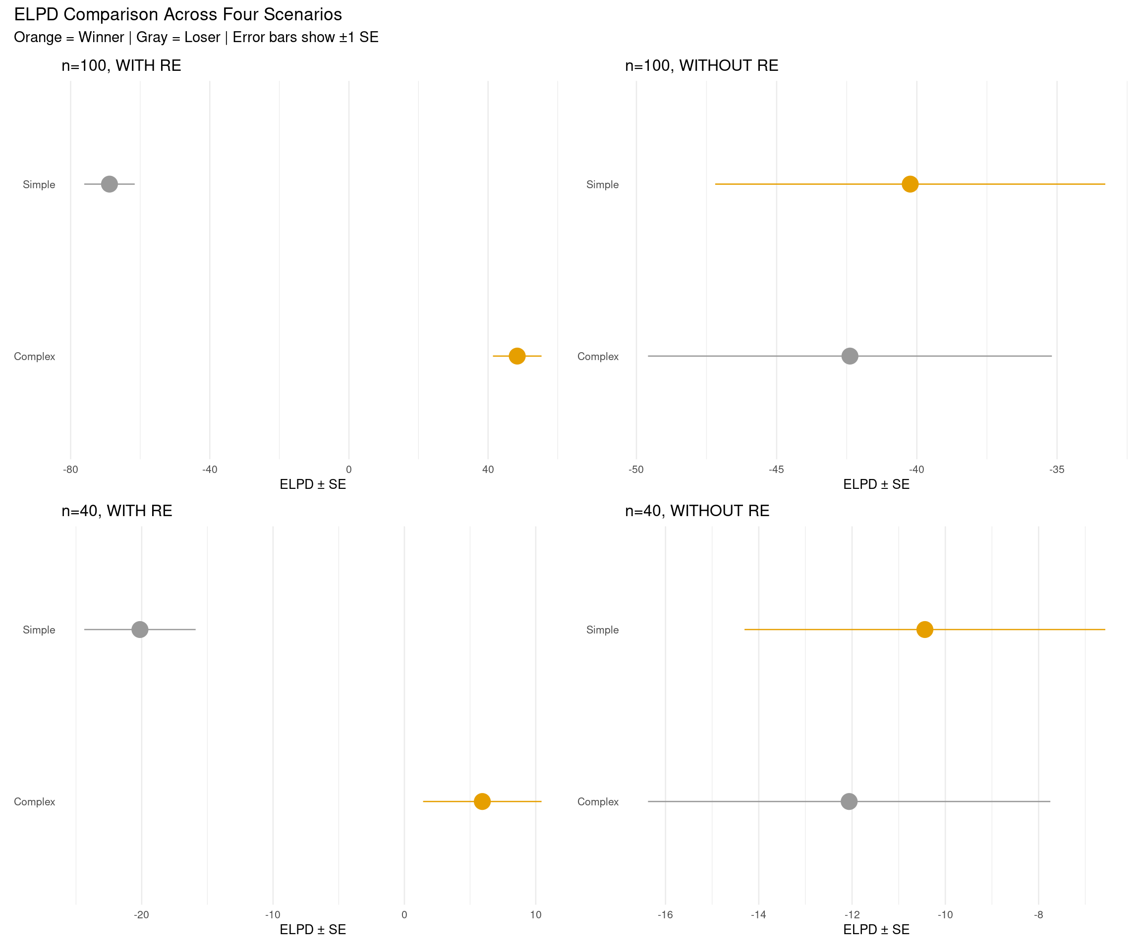# Add LOO criterion to all modelsfit_simple_100_with <-add_criterion(fit_simple_100_with, "loo")fit_medium_100_with <-add_criterion(fit_medium_100_with, "loo")fit_complex_100_with <-add_criterion(fit_complex_100_with, "loo")fit_simple_100_without <-add_criterion(fit_simple_100_without, "loo")fit_complex_100_without <-add_criterion(fit_complex_100_without, "loo")fit_simple_40_with <-add_criterion(fit_simple_40_with, "loo")fit_complex_40_with <-add_criterion(fit_complex_40_with, "loo")fit_simple_40_without <-add_criterion(fit_simple_40_without, "loo")fit_complex_40_without <-add_criterion(fit_complex_40_without, "loo")# Display individual LOO results showing progression of model complexityprint("Example: Individual LOO output for simple model (n=100, WITH RE)")