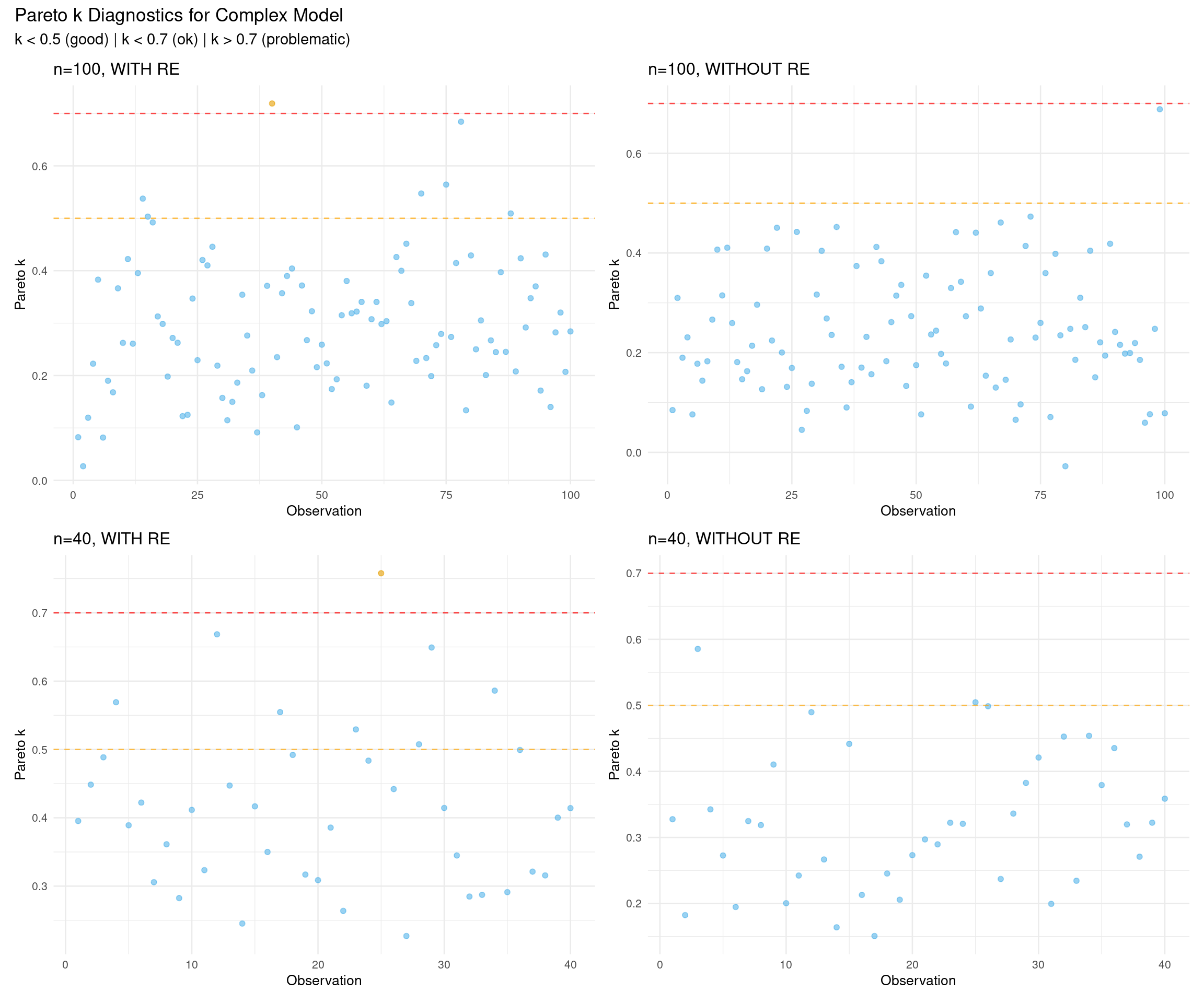 [1] "Example: Individual LOO output for complex model (n=100, WITH RE)"